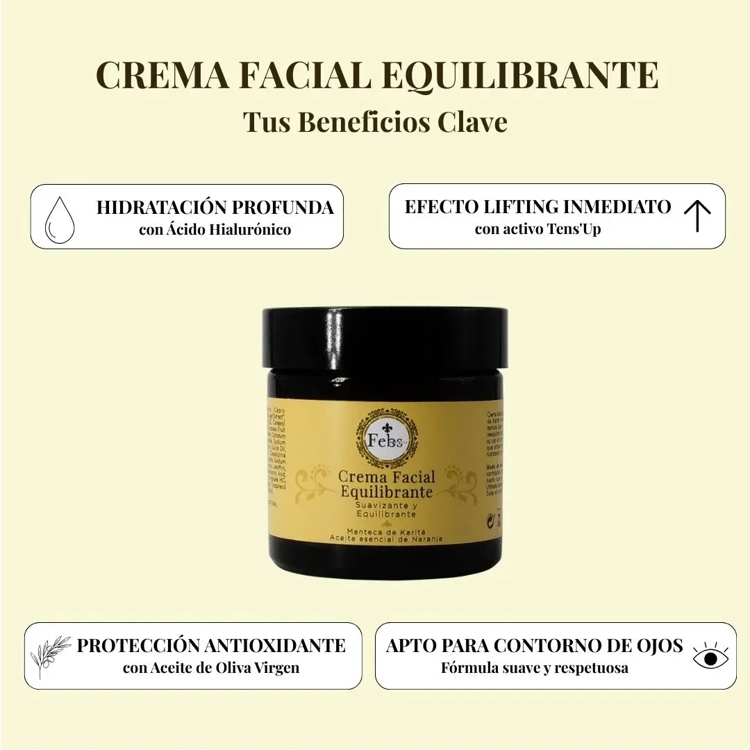 Piel hidratada y saludable durante todo el día con la Crema Facial Equilibrante. Su fórmula con Ácido Hialurónico proporciona una hidratación profunda y duradera, equilibrando el sebo y previniendo la sequedad. Ideal para pieles mixtas, grasas y sensibles. Libre de químicos agresivos.